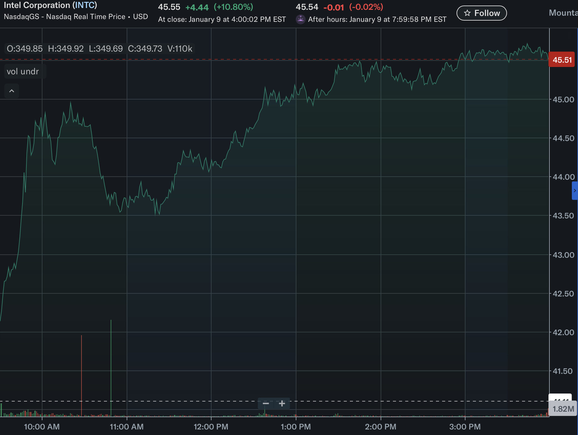 Shares of Intel Corporation surged on Friday, closing at $45.55 after gaining 10.8% in a single session, following public comments from President Trump praising the company’s leadership and U.S.-based manufacturing strategy.