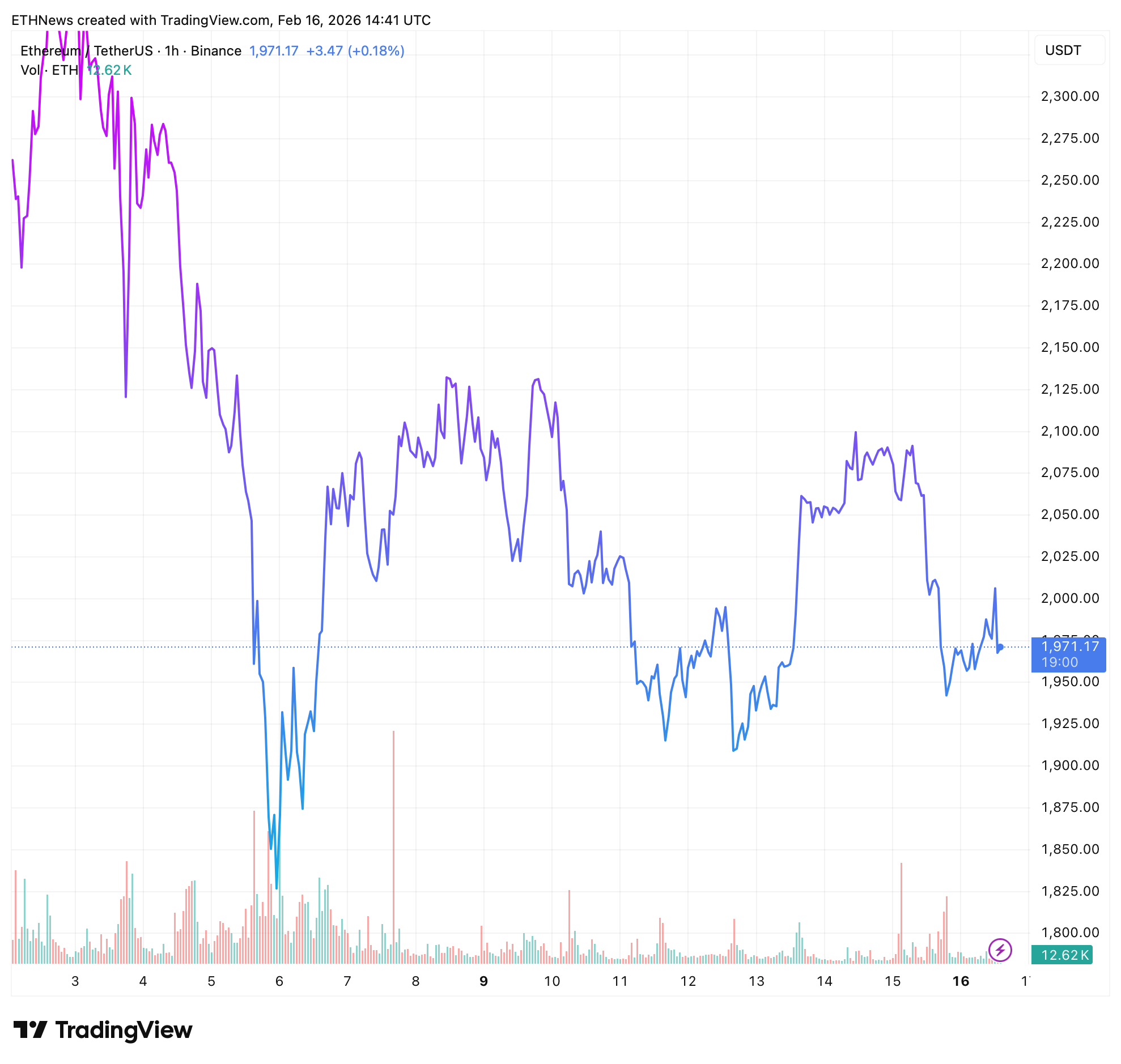 On the TradingView 1-hour chart, ETH is trading at $1,971, consolidating after rejecting from the $2,100–$2,120 region earlier in the week. The selloff into $1,900 was aggressive, but subsequent candles have shown smaller bodies and reduced volatility, signaling short-term balance between buyers and sellers.