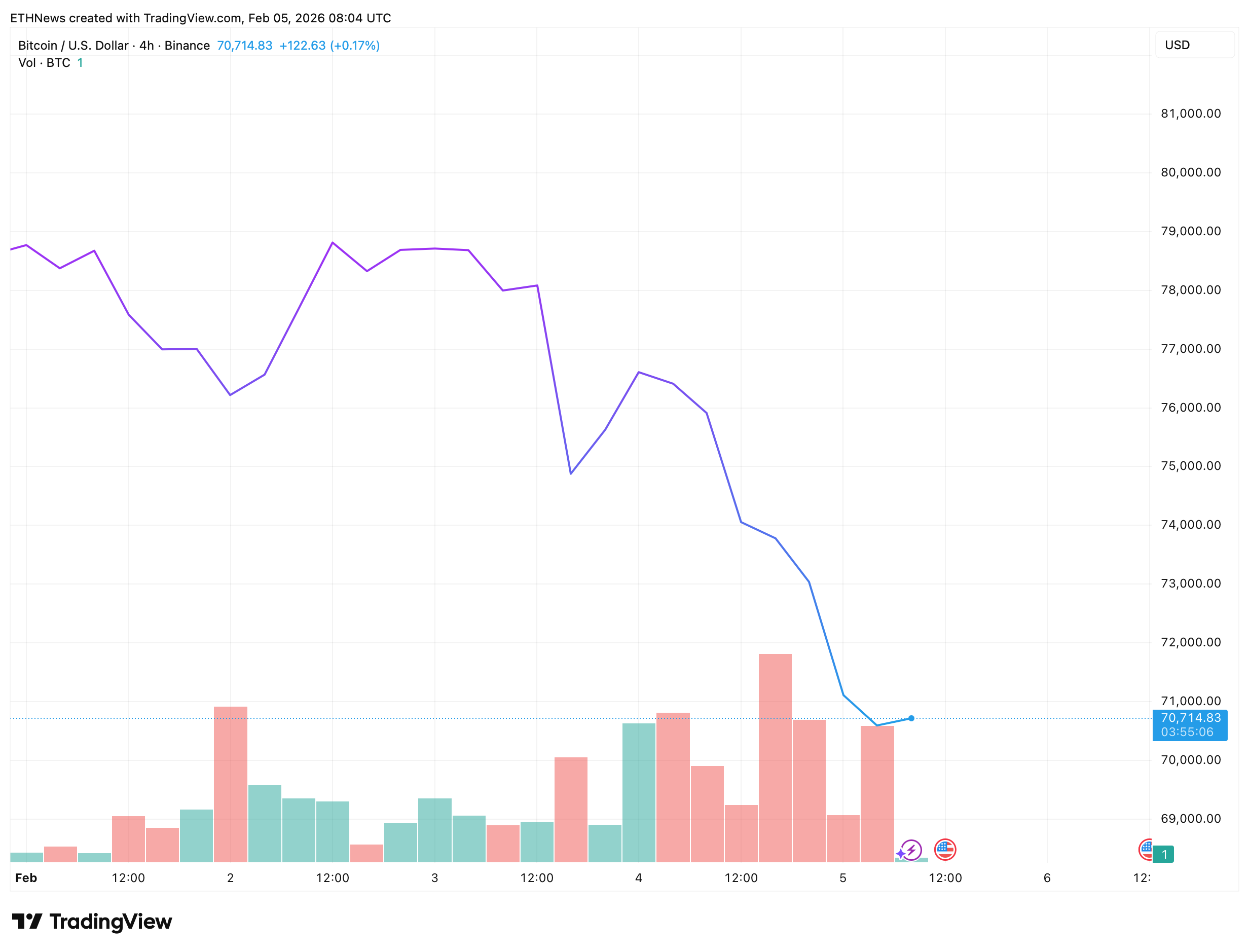 The Bitcoin chart from the beginning of February shows a clear deterioration in structure following Cramer’s bullish statement. After trading near local highs at the start of the month, price failed to establish acceptance above resistance and instead rolled over, transitioning into a sequence of lower highs and lower lows.