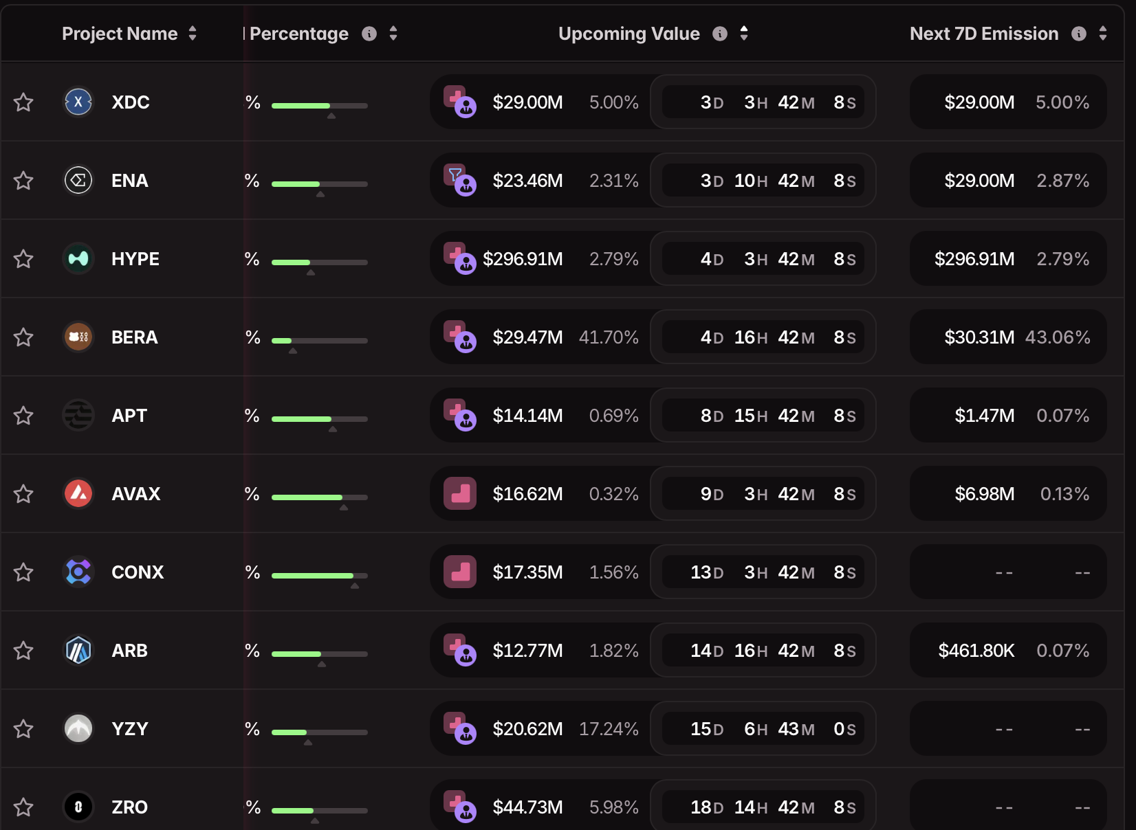- BERA shows the highest relative pressure in the short term. An unlock of $29.47M equates to 41.70% of supply, with the seven-day emission figure rising to 43.06%. This places BERA in a distinctly higher-risk category from a dilution standpoint.