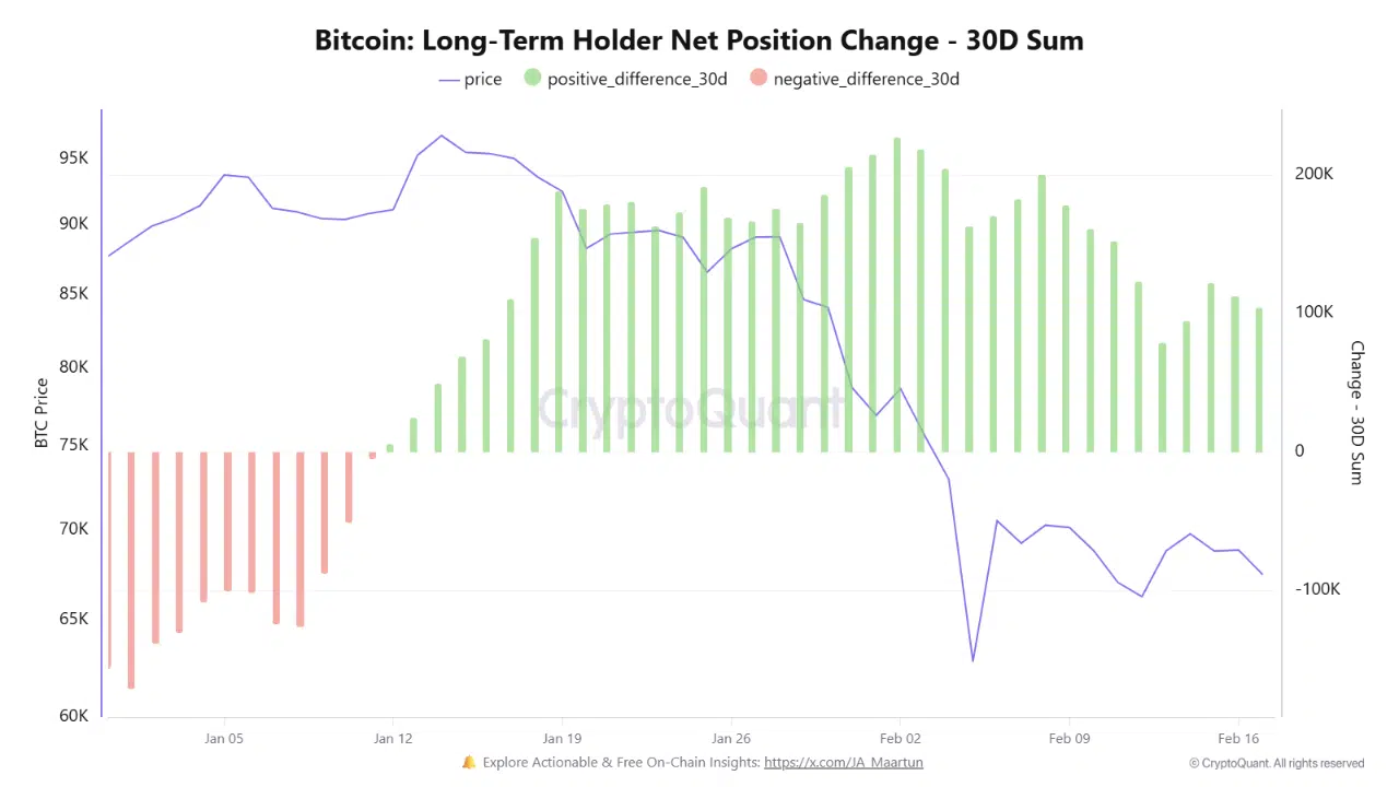 When Bitcoin dropped into the $62,000–$68,000 range, long-term holders shifted behavior. Instead of continuing to distribute, they began accumulating again.
