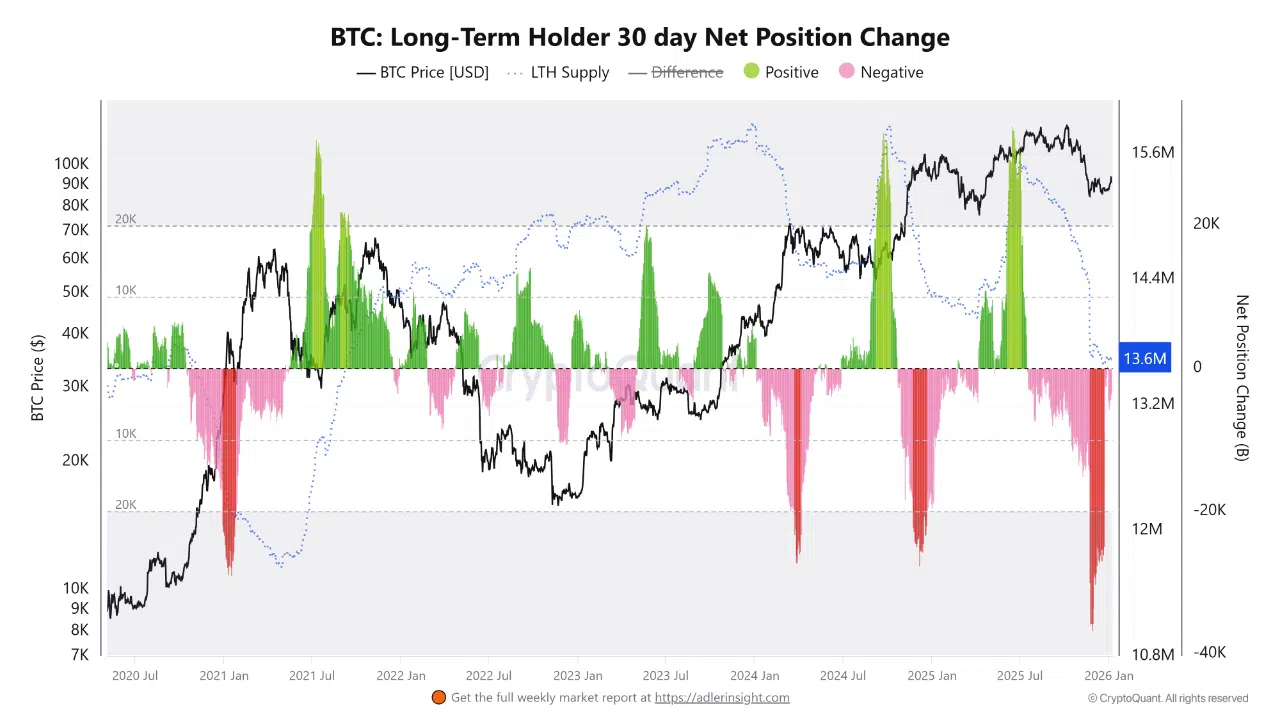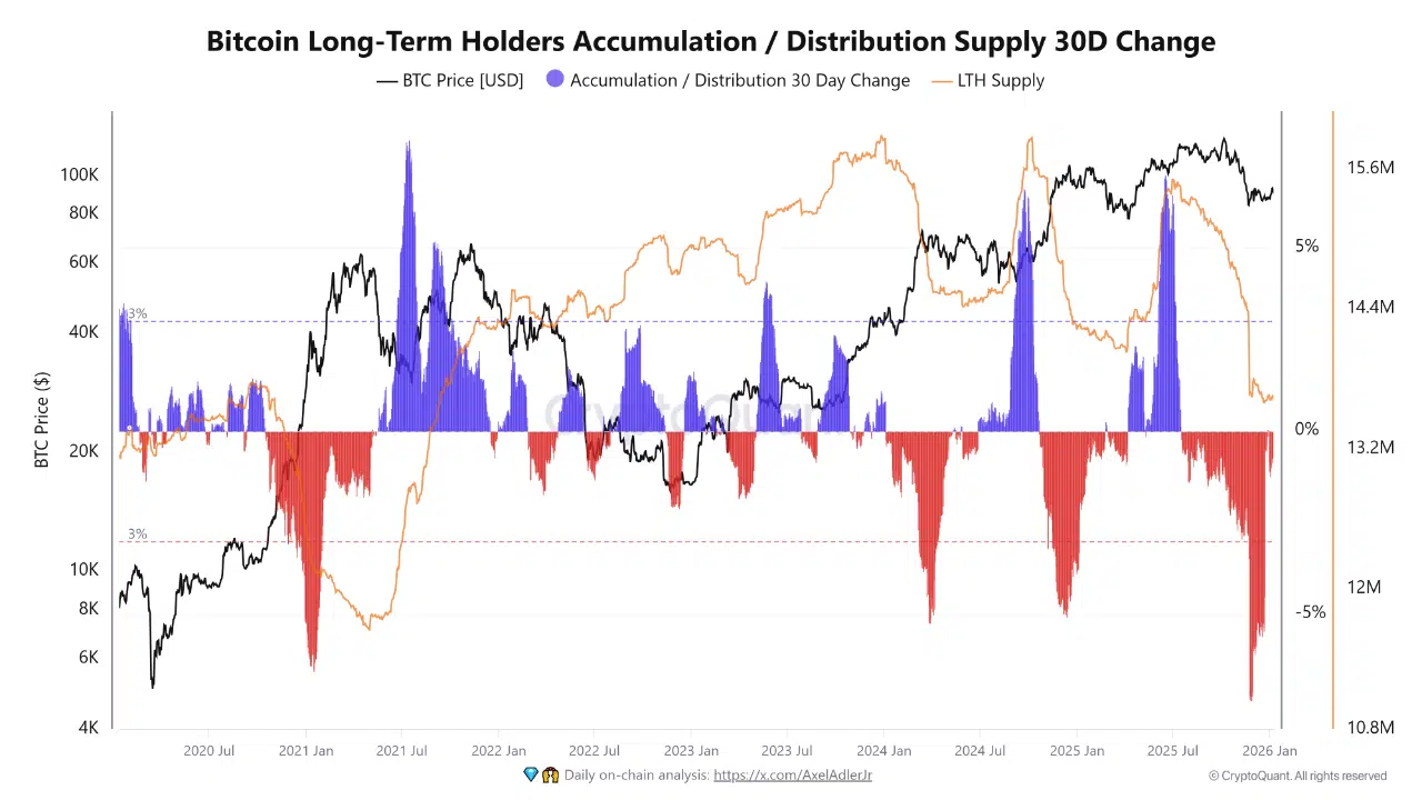 Recent on-chain data shared by CryptoQuant shows a clear change in Bitcoin’s supply dynamics, as long-term holders (LTHs) move into sustained distribution.
