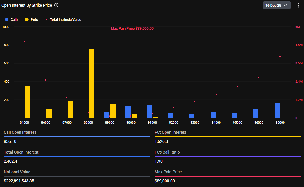 Bitcoin accounts for the majority of the expiring contracts, with $222.8 million in BTC options scheduled to settle. The chart identifies $89,000 as the max pain price, the level where the largest number of options would expire without value.