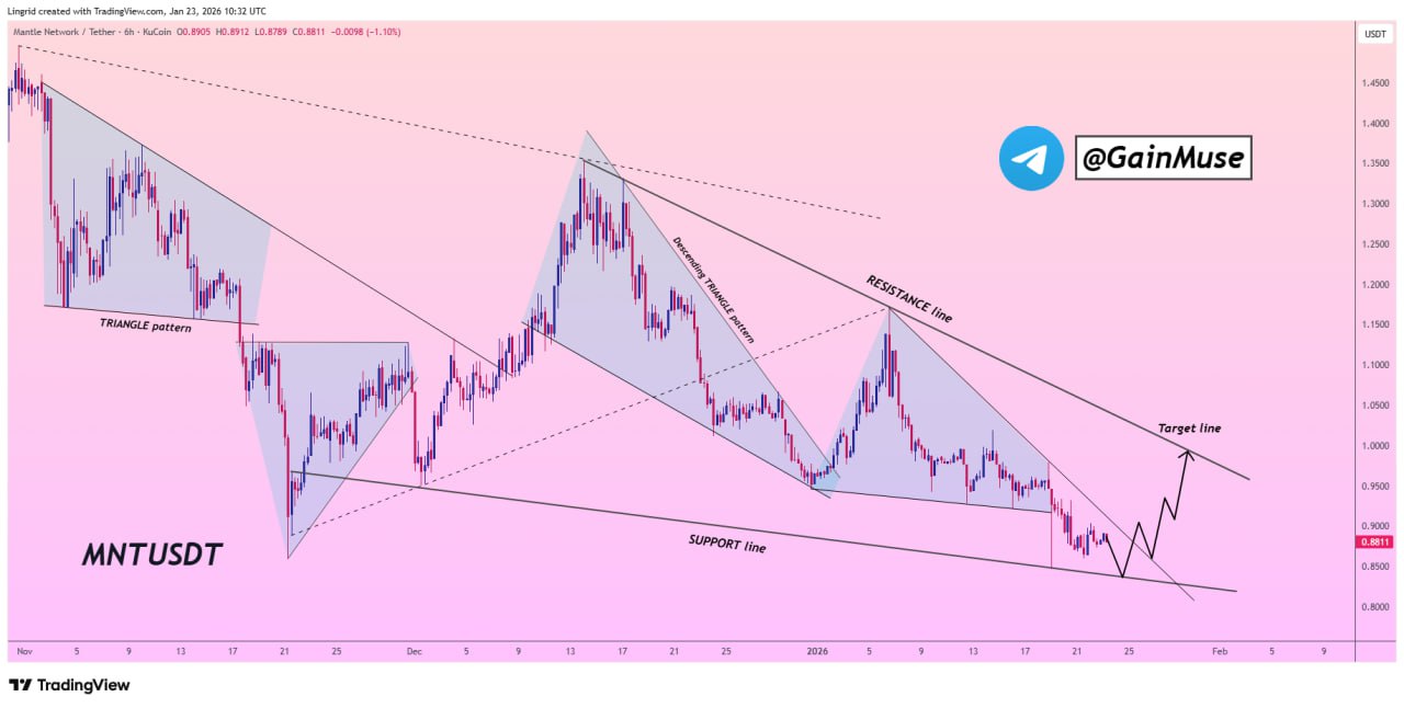 From the TradingView chart, MNT has repeatedly defended the $0.87–$0.88 support area, which aligns with the lower boundary of the descending structure highlighted in the GainMuse analysis.