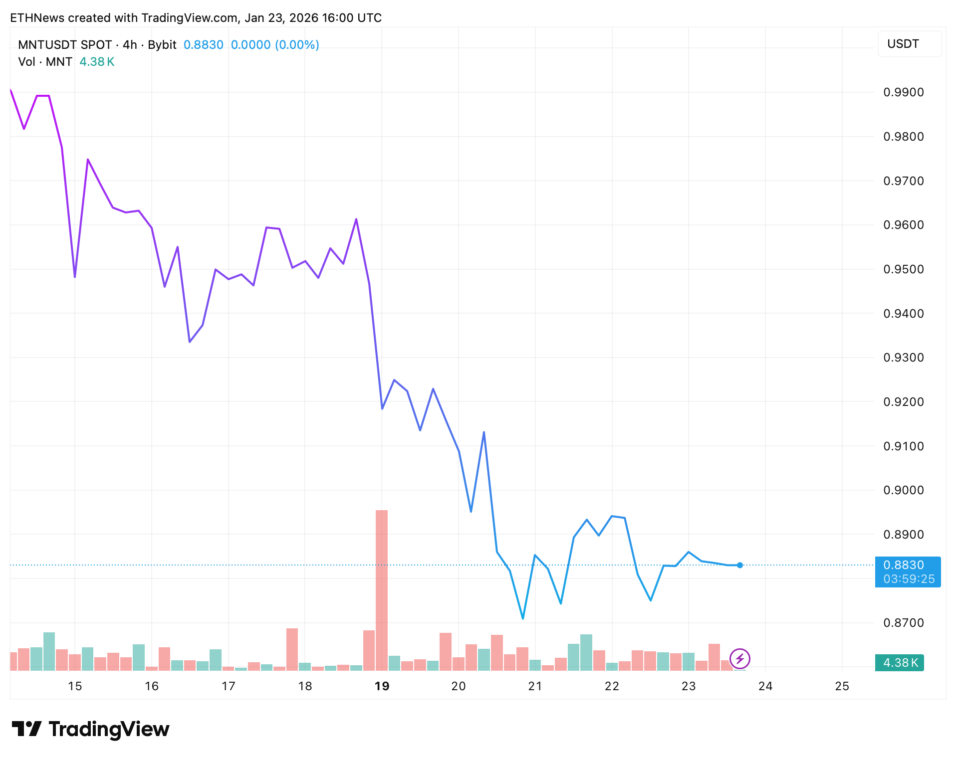 Mantle (MNT) is trading at a technically sensitive zone after an extended downside move, with price currently hovering around $0.88 on the 4-hour chart.