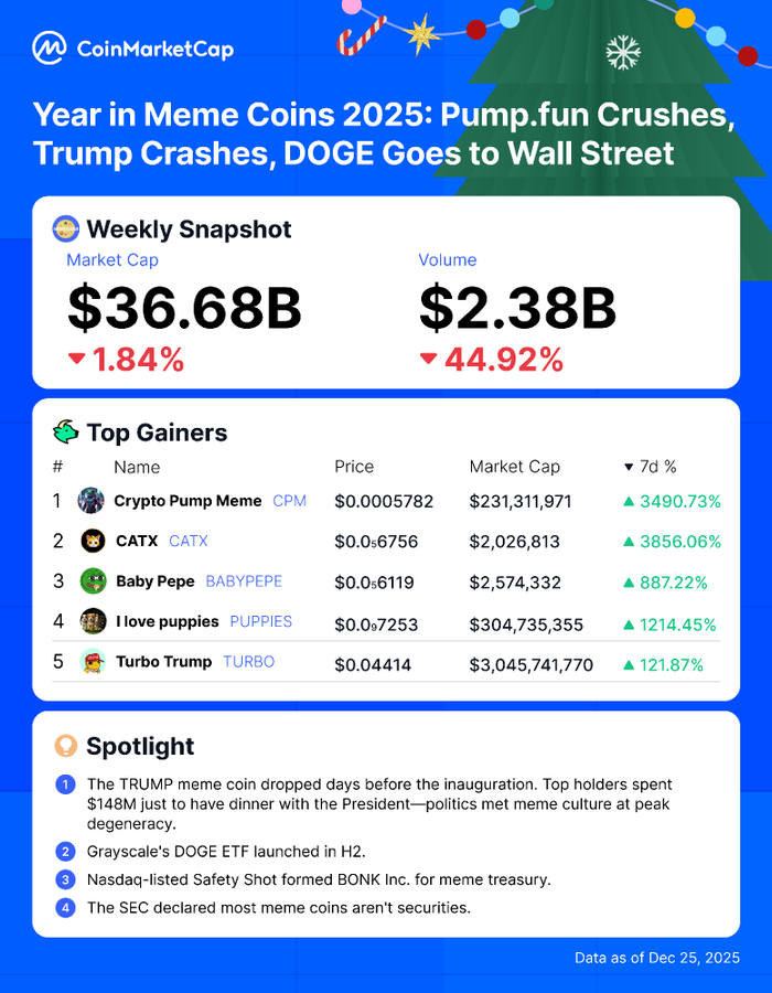 According to the snapshot dated December 25, 2025, the total meme coin market capitalization stood at $36.68 billion, down 1.84% over the week. Trading activity declined even more sharply, with total volume falling to $2.38 billion, a steep 44.92% weekly drop.
