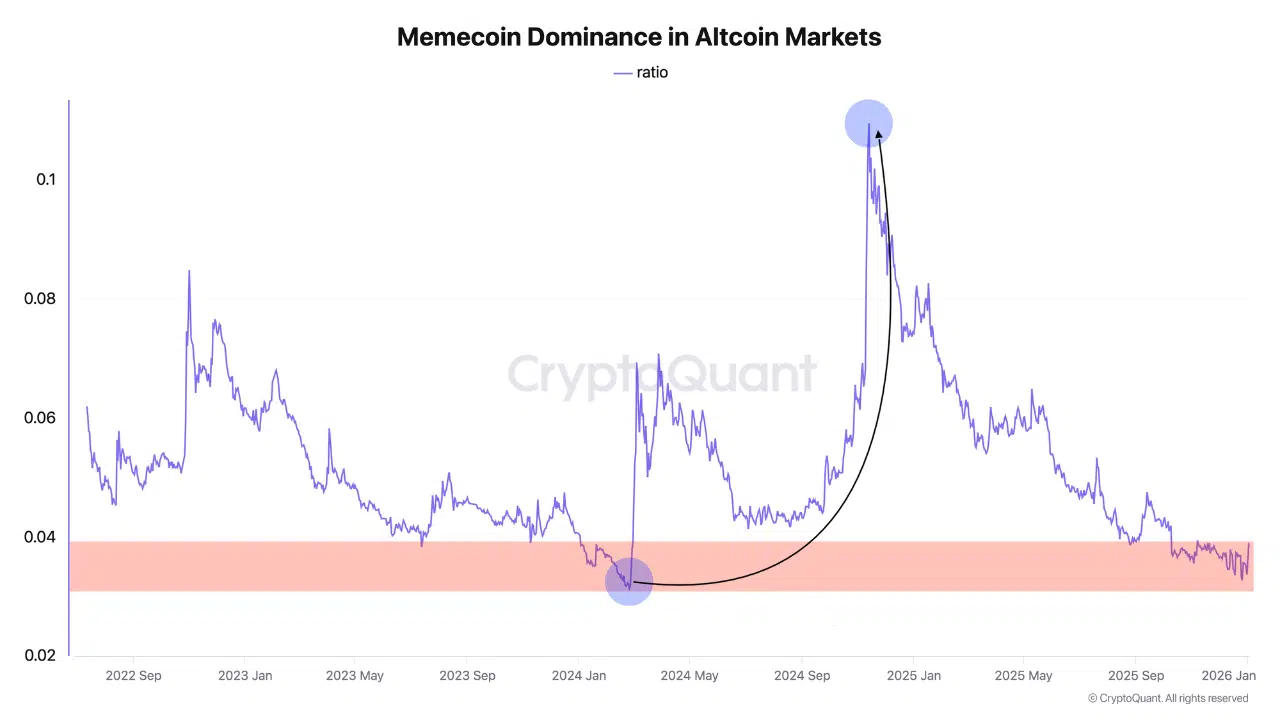 A new on-chain analysis shared by CryptoQuant suggests that memecoins may be staging an early comeback after a prolonged period of decline within the altcoin market.