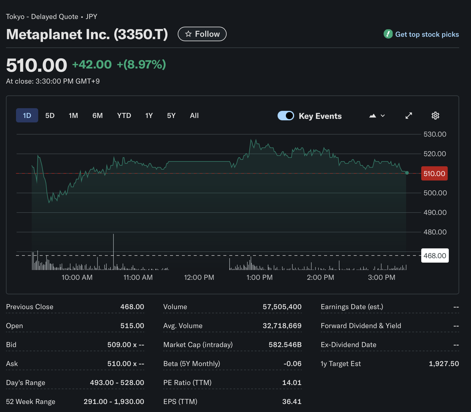 At the close, Metaplanet’s intraday market capitalization stood at ¥582.546 billion. The stock currently trades with a P/E ratio (TTM) of 14.01 and earnings per share (TTM) of 36.41. The reported beta of -0.06 suggests limited correlation with broader market volatility over the measured period.