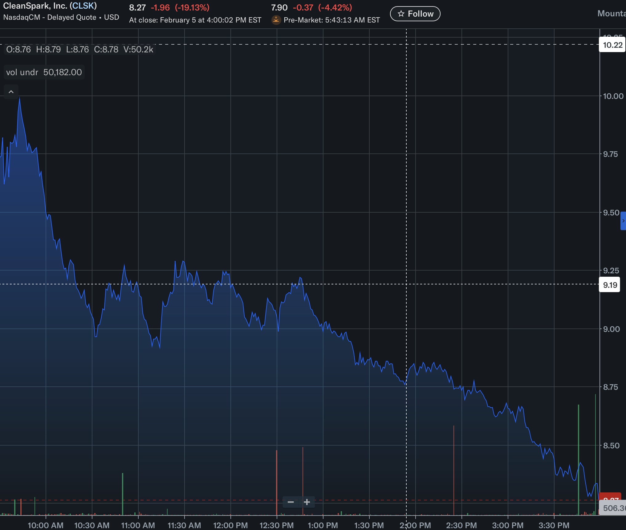 CleanSpark experienced even steeper price declines as the session progressed. Shares dropped nearly 19.2% during regular trading before falling another 10% after-hours, placing the stock among the worst performers in the mining cohort.