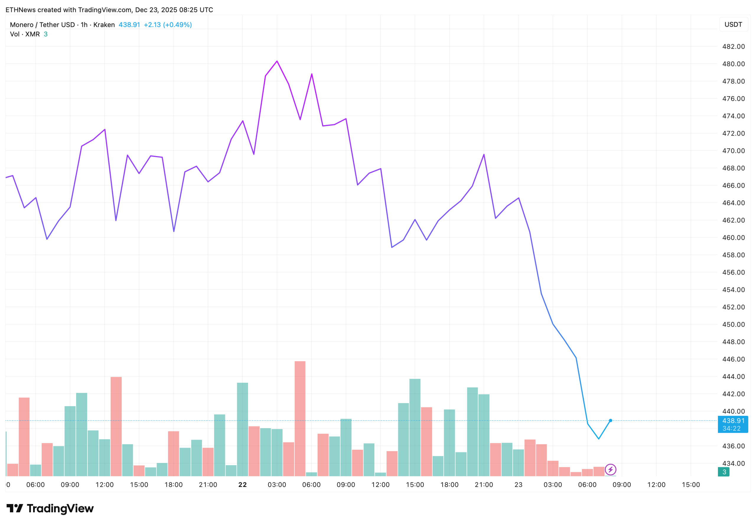 Monero (XMR) is facing renewed downside pressure after a sharp intraday sell-off pushed price back toward the $438–$440 zone.