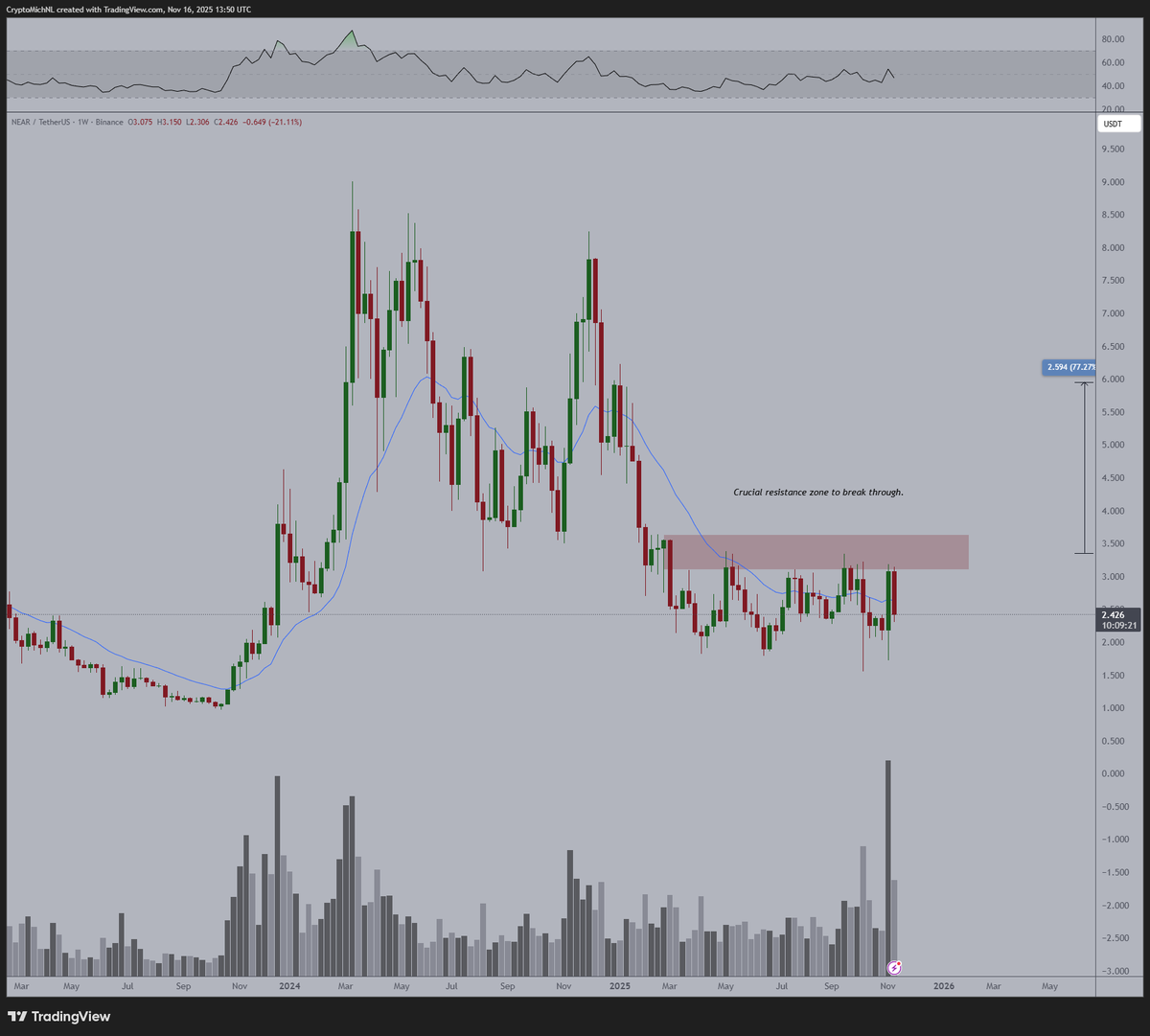 NEAR’s higher-timeframe chart shows a clear resistance band around $3.20–$3.60, which has capped every rally since the summer. Analysts argue that once Bitcoin finishes carving out a bottom of its own, assets that previously led the market, such as NEAR, tend to bounce the fastest.