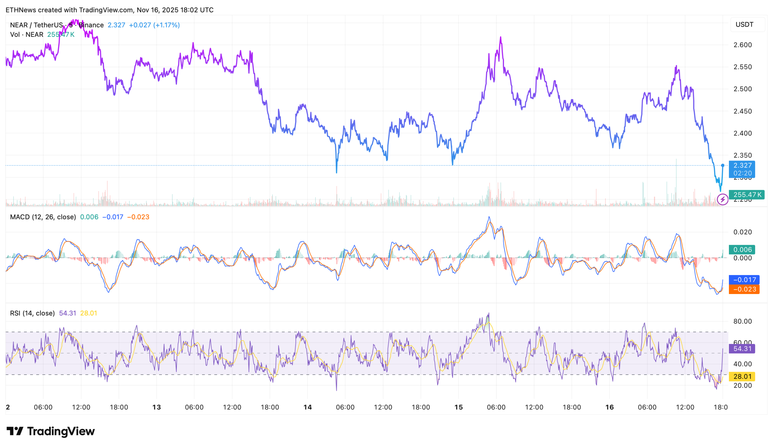 On TradingView, NEAR’s short-term chart shows heavy volatility, with MACD momentum still negative but edging upward, while the RSI touched oversold territory earlier in the day. That combination, weak trend, but early momentum recovery, often appears during market exhaustion phases.