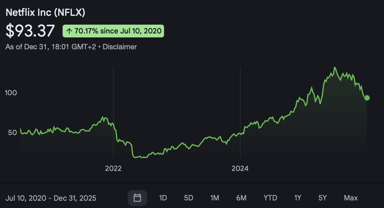 As of December 31, 2025, Netflix shares were trading around $93.3, placing the stock near the lower end of its 52-week range between $82.1 and $134.1. NFLX fell roughly 20% during Q4 2025, underperforming the broader S&P 500 as investors questioned whether the company can sustain its historical growth trajectory.