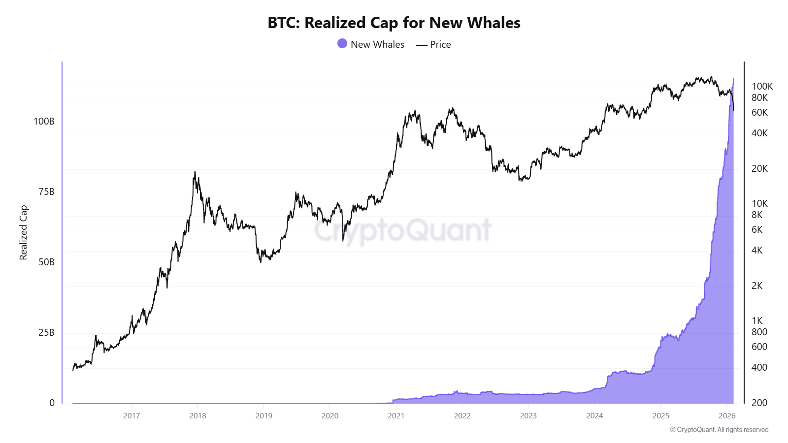 According to data from CryptoQuant, the realized cap of new Bitcoin whales has continued to rise even as Bitcoin’s price moved lower, signaling sustained accumulation during the recent decline.