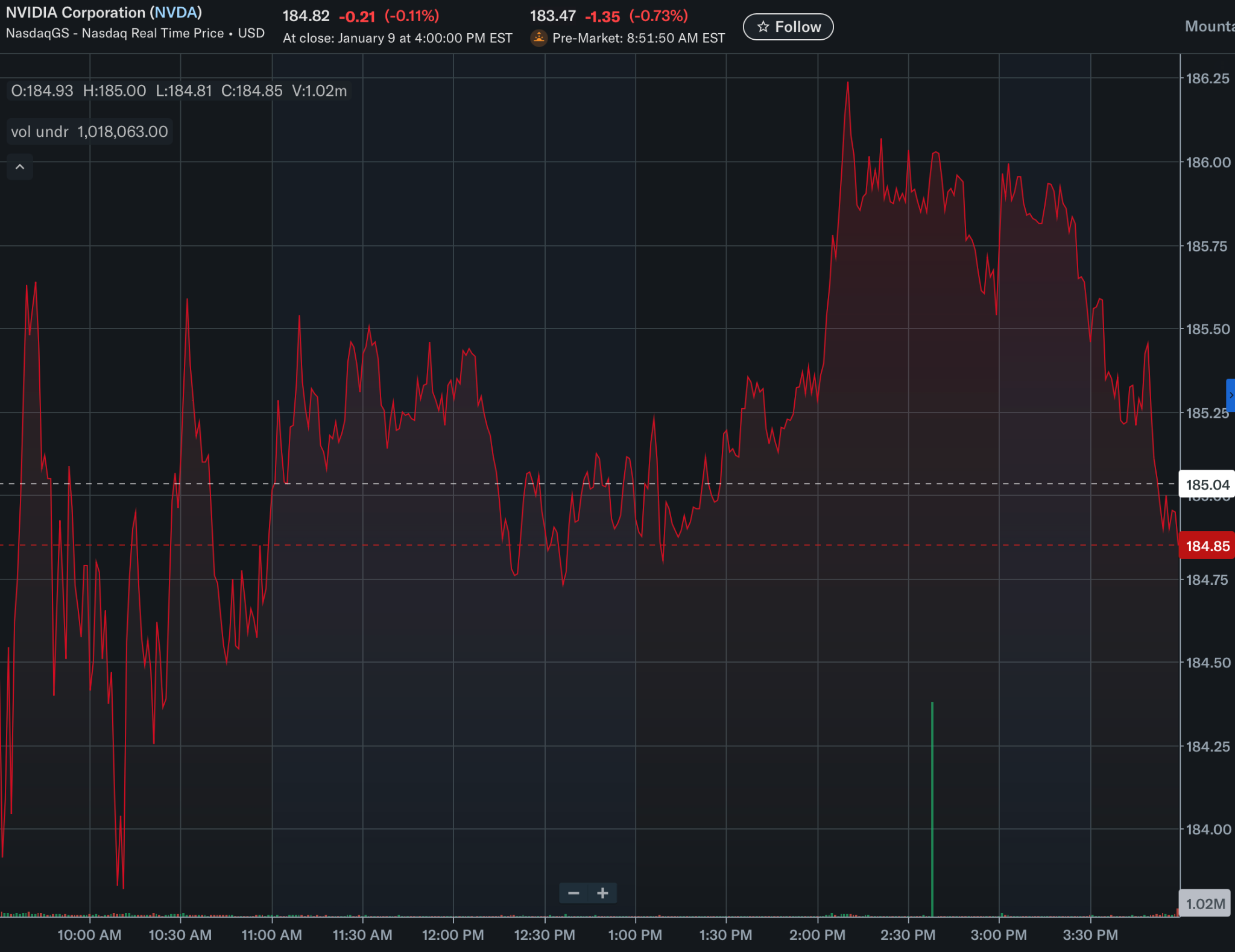 Nvidia shares are consolidating on Monday, January 12, after an active session that saw sharp intraday swings but little net progress. The latest chart shows NVDA fluctuating around the $184–$185 zone.