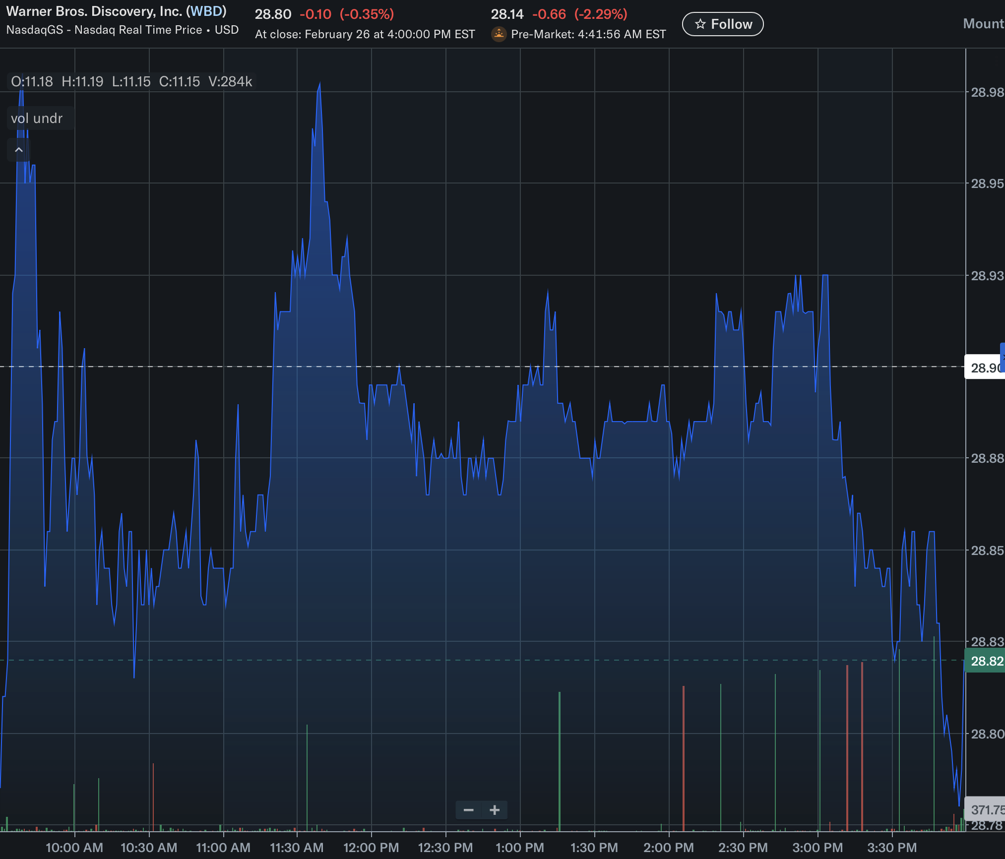 Meanwhile, Warner Bros. Discovery (WBD) closed at $28.80 (-0.35%) and slipped further to $28.14 in pre-market (-2.29%).