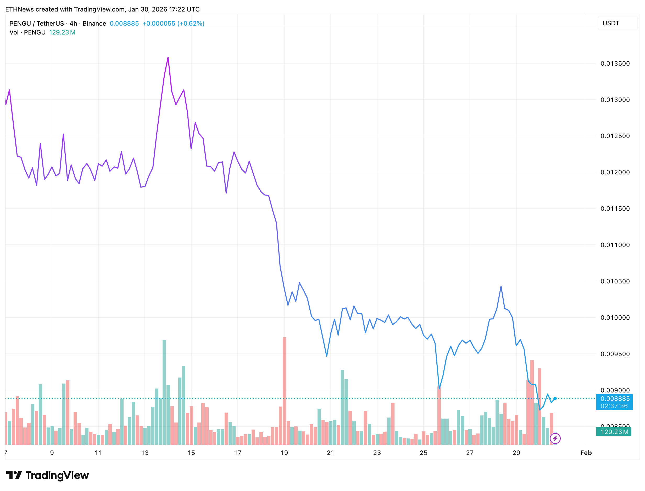 On the 4-hour Binance chart, PENGU is trading near $0.0089, following a sustained decline from the mid-January highs above $0.0130.