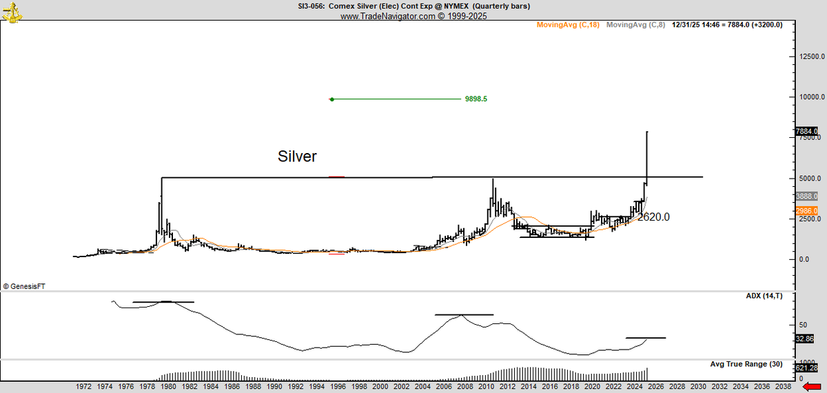 Based strictly on what the chart and commentary show, silver appears structurally strong on the quarterly timeframe, with trend strength still far from levels historically associated with overbought conditions.
