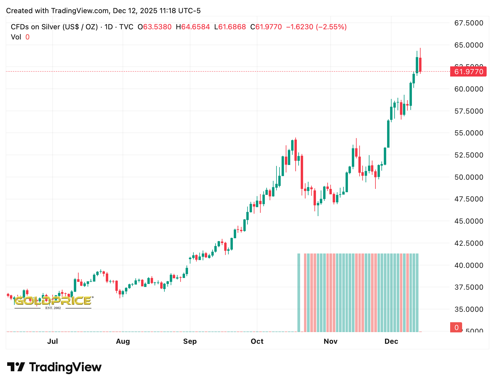 In December, silver briefly spiked above $64 per ounce before pulling back slightly, with the latest daily close shown near $61.97. Despite the short-term pullback, the broader structure remains firmly bullish, reflecting the sharp upside expansion Schiff referenced.