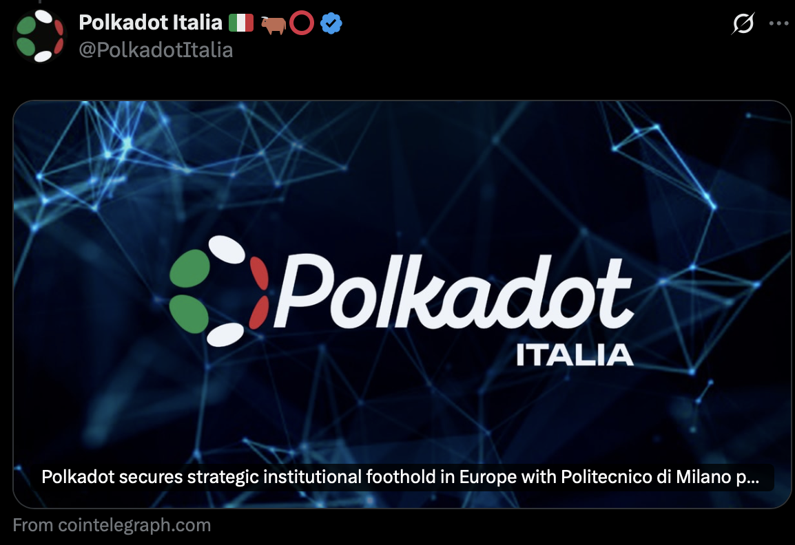 “The partnership reflects Polkadot’s evolution beyond a developer-focused network,” a spokesperson for Polkadot Italia DAO noted. “We are now engaging directly with institutions that shape financial and regulatory policy in Europe.”