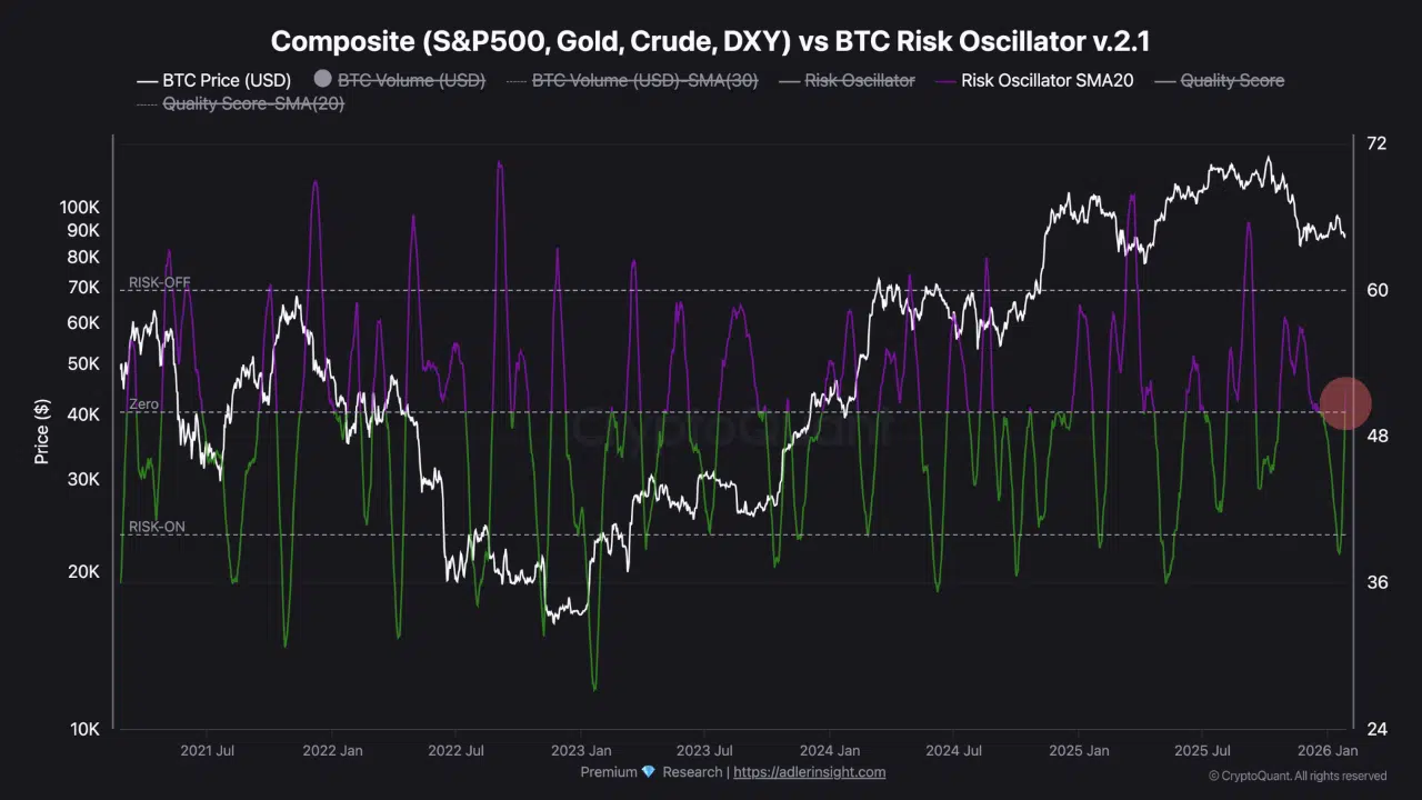 Historically, readings at this level reflect declining global risk appetite rather than temporary volatility. The last comparable risk-off signal occurred on October 22, shortly before a sharp Bitcoin drawdown. That signal played out with precision, confirming the indicator’s reliability in identifying macro-driven stress phases.