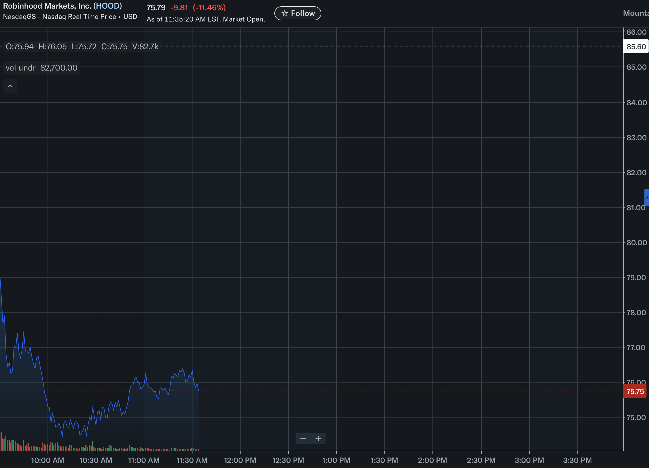 Robinhood shares fell 11.5% to $75.83 on February 11, 2026, after the company reported fourth-quarter results that missed revenue expectations, largely due to a sharp slowdown in cryptocurrency trading activity.