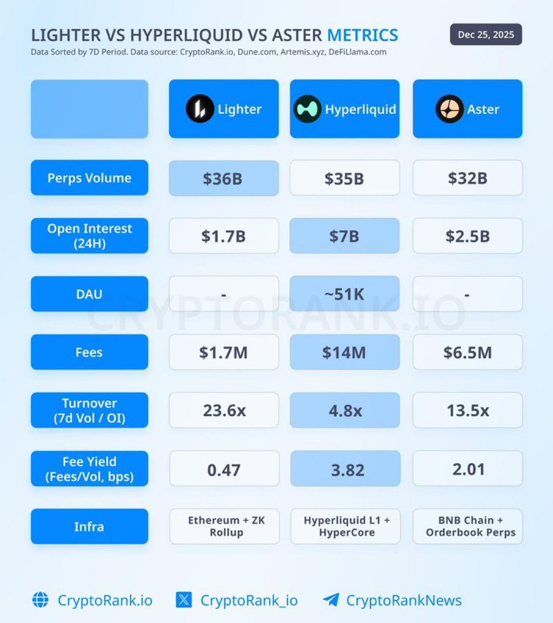 A side-by-side metrics comparison dated December 25, 2025 highlights how three onchain perpetual platforms, Lighter, Hyperliquid, and Aster, are scaling in sharply different ways, despite operating in the same fast-growing perp market.