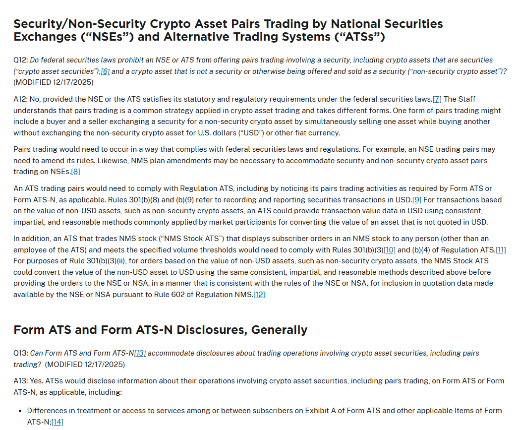 New guidance confirms that National Securities Exchanges (NSEs) and Alternative Trading Systems (ATSs) can facilitate direct trading between security tokens and non-security crypto assets like Bitcoin.
