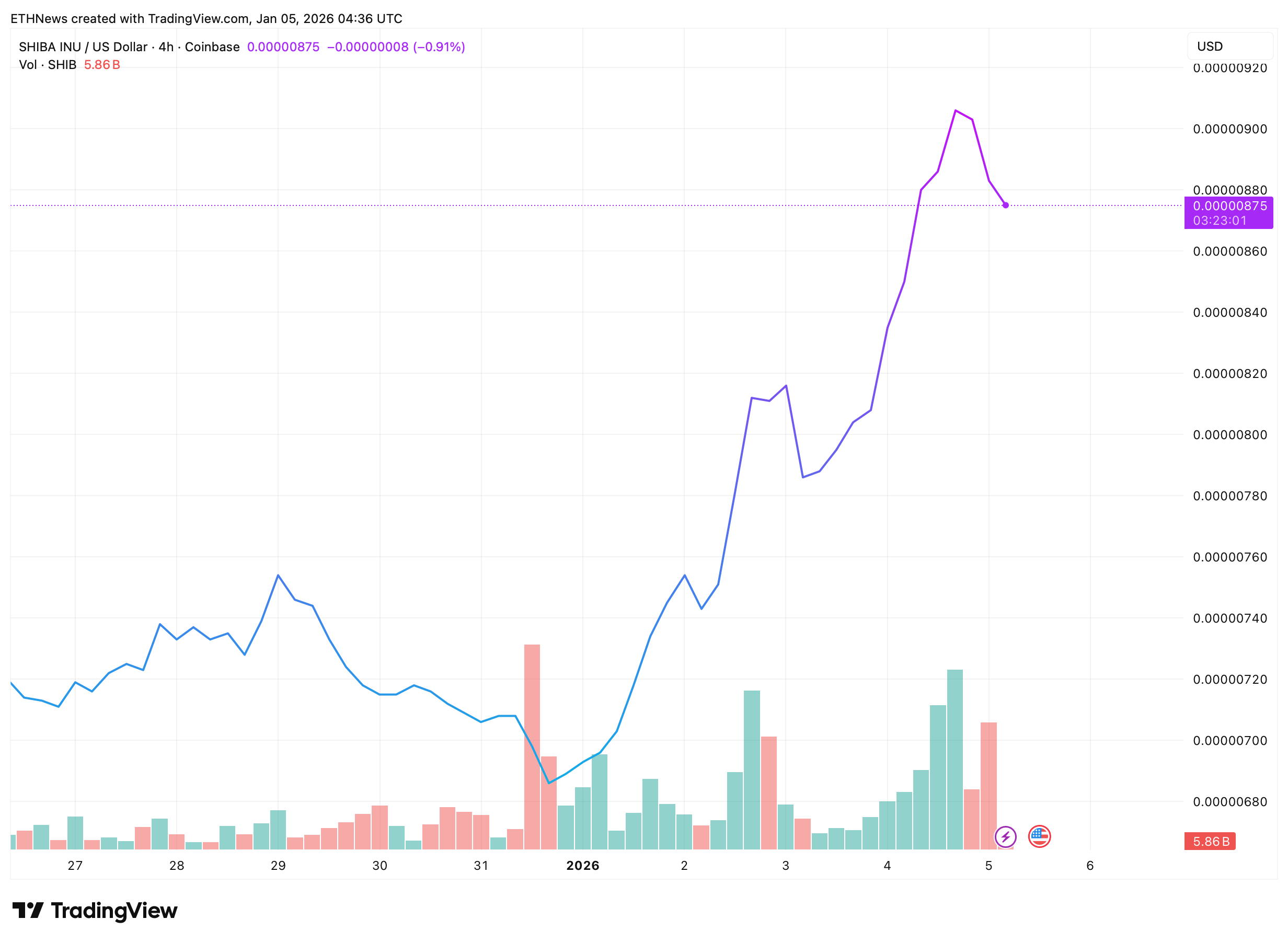 The TradingView price chart shows SHIB accelerating sharply into the start of 2026, supported by expanding volume during the move higher. While a small pullback followed the recent peak, price remains well above late-December levels, suggesting buyers are still defending gains.