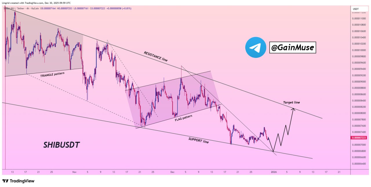 The higher-timeframe technical structure shared by crypto trader GainMuse highlights a prolonged bearish channel that has defined SHIB’s price action for months. Price continues to trade below a descending resistance line, reinforcing that the dominant trend has not yet shifted.