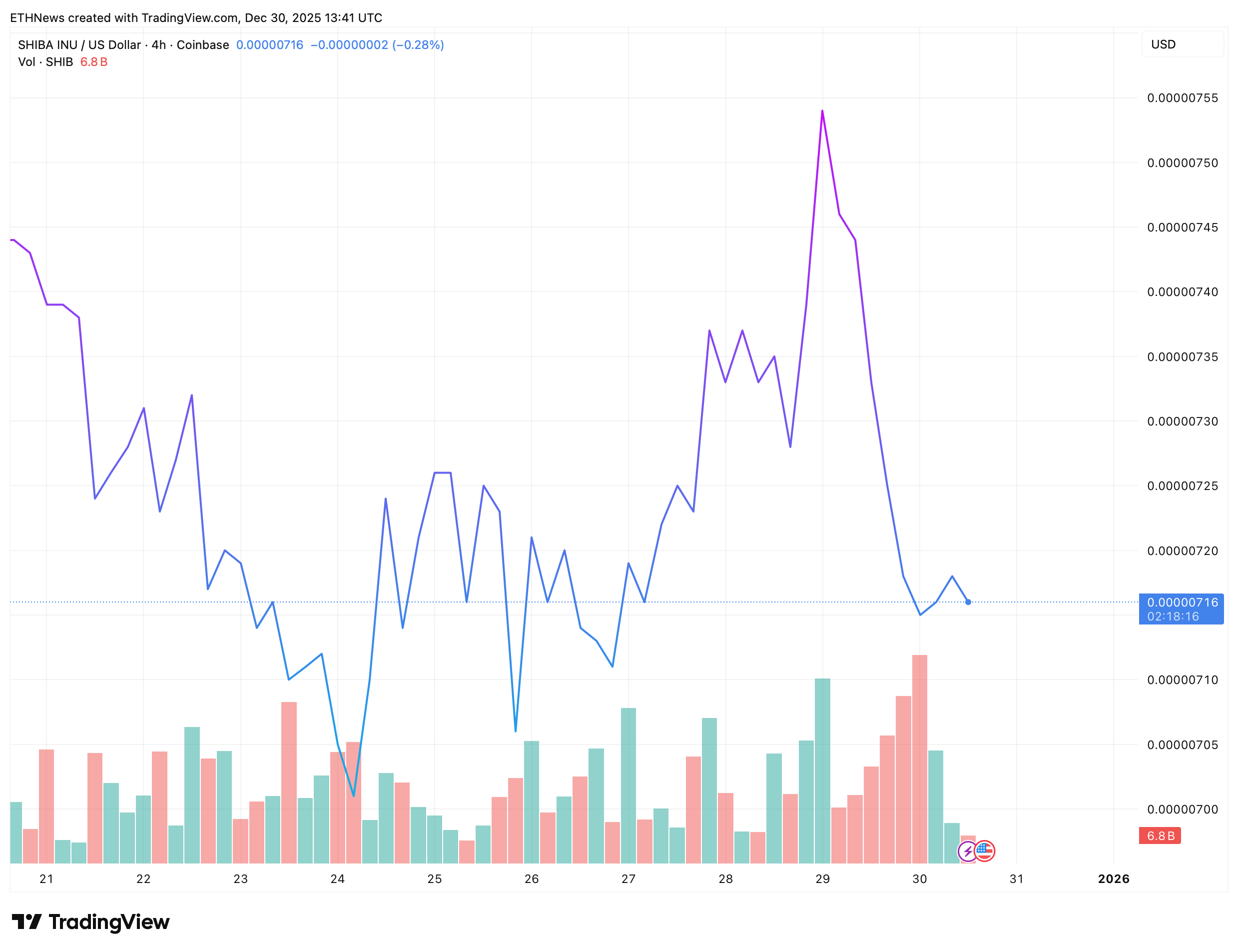 The TradingView 4-hour chart reinforces this view. After a brief rally attempt toward the $0.0000075 area, SHIB was quickly rejected and moved back toward its current base near $0.0000071–$0.0000072. The rejection was decisive, suggesting sellers remain active on rebounds.