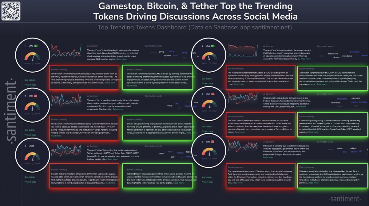 Social media platforms are currently flooded with discussions about a diverse mix of assets, both traditional and digital, as investors hunt themes worth chasing. Based on data from Santiment and other crypto-analytics firms, trending keywords include GME, BTC, USDT, KDA, LINK, and ETH.