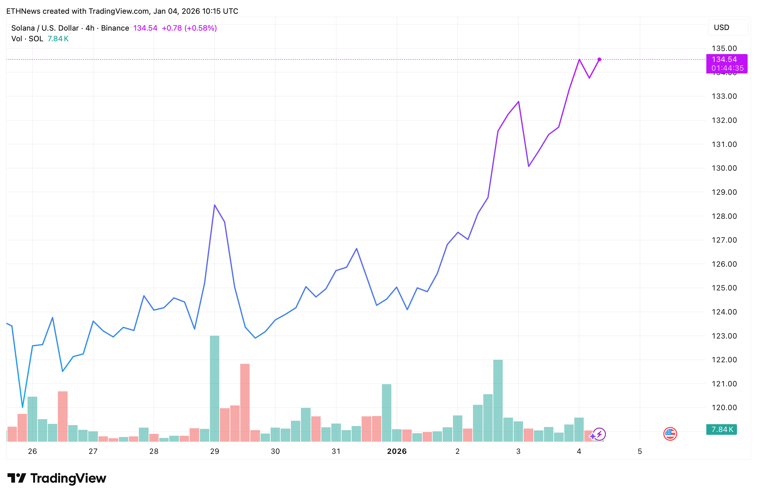 Solana (SOL) has extended its short-term recovery, gaining roughly 8% on a weekly basis and stabilizing above the $134 level, according to the latest data. The move follows a steady sequence of higher lows and higher highs that began forming in late December, signaling improving short-term structure despite broader market caution.