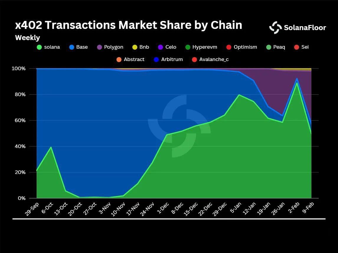 The x402 Transactions Market Share by Chain chart from SolanaFloor covers late September 2025 through early February 2026, and the trajectory of Solana’s share across that period is the most notable feature of the data.