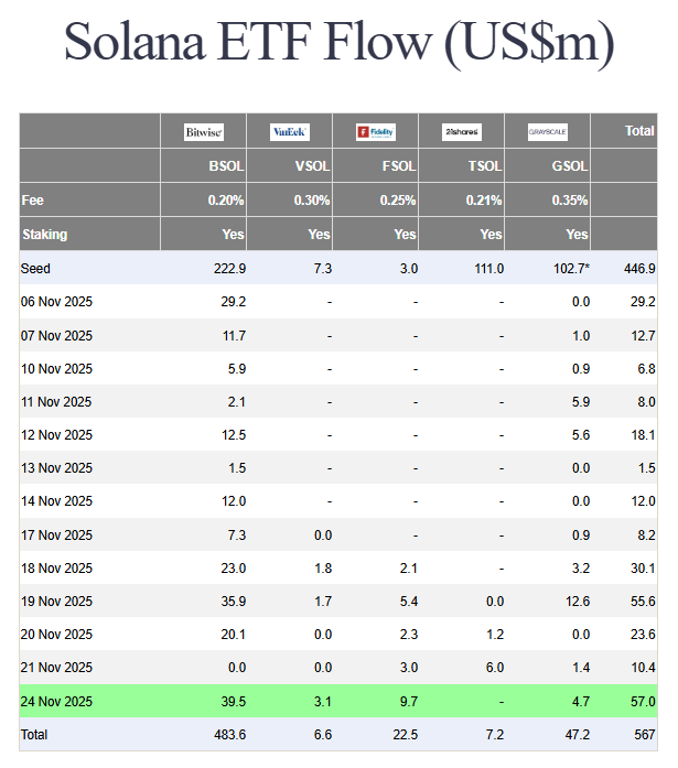 The latest numbers from November 24 show another strong session, with $57 million flowing into Solana ETFs across Bitwise, VanEck, Fidelity, and Grayscale. Bitwise once again led the pack, adding $39.5 million, followed by Fidelity with $9.7 million, while VanEck and Grayscale contributed $3.1 million and $4.7 million respectively.
