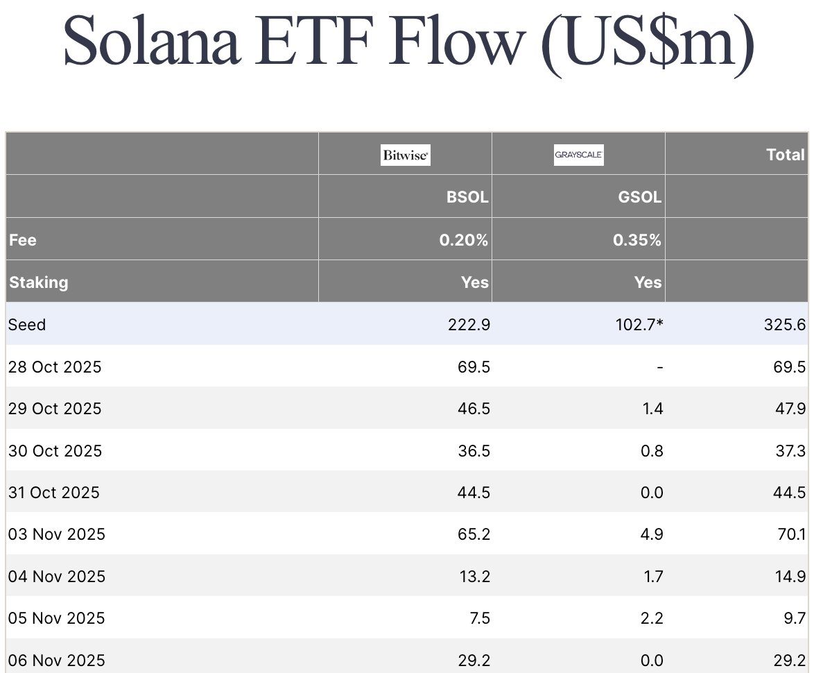 - Bitwise’s BSOL fund has consistently led with inflows ranging between $7.5 million and $69.5 million per day, totaling over $325.6 million since inception.