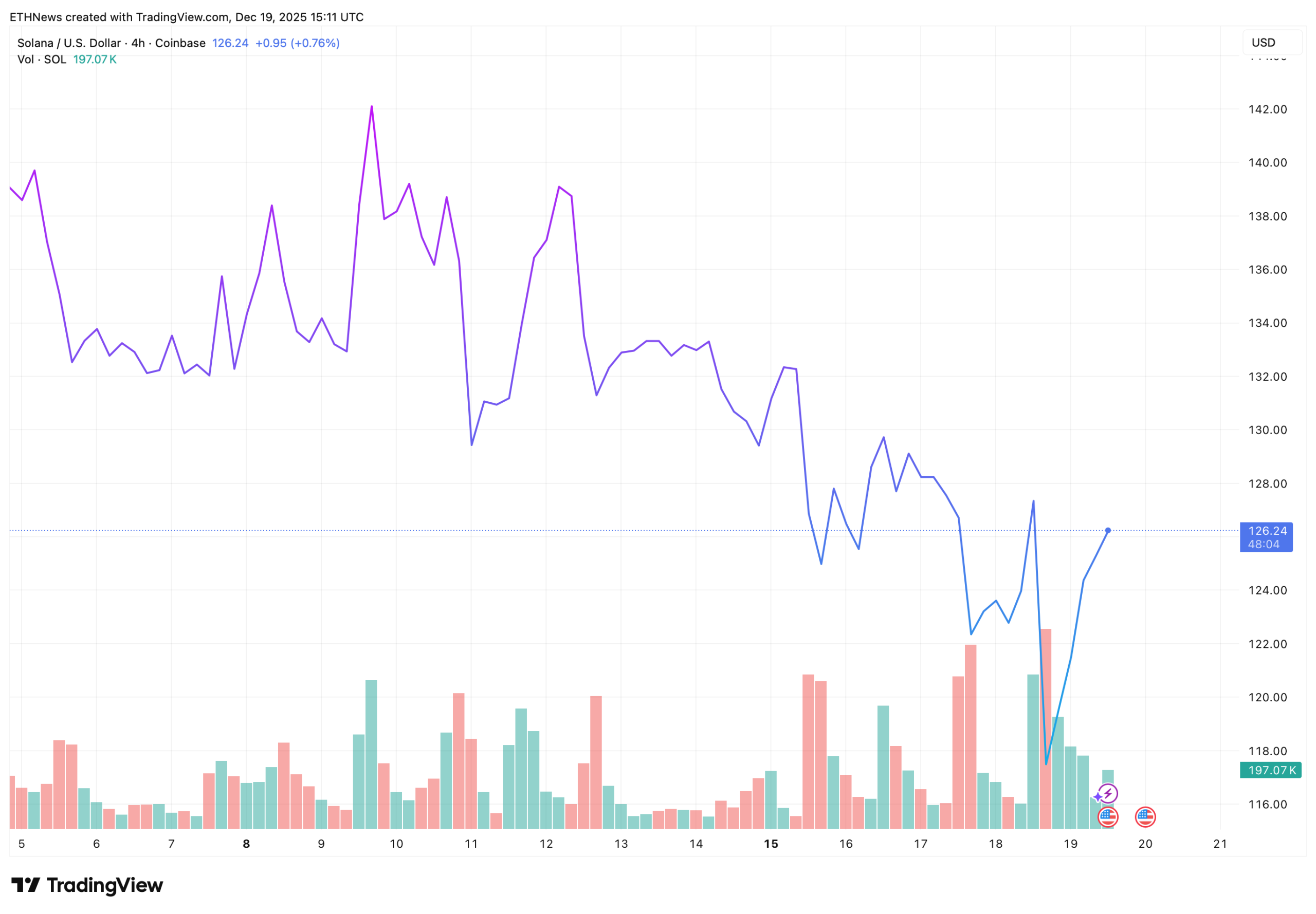 The 4-hour chart supports this cautious interpretation. Solana is currently trading around $126, after failing to hold above prior consolidation zones in the low-to-mid $130s. The structure shows wide swings, with strong selling pressure emerging on down moves and limited follow-through on rebounds.