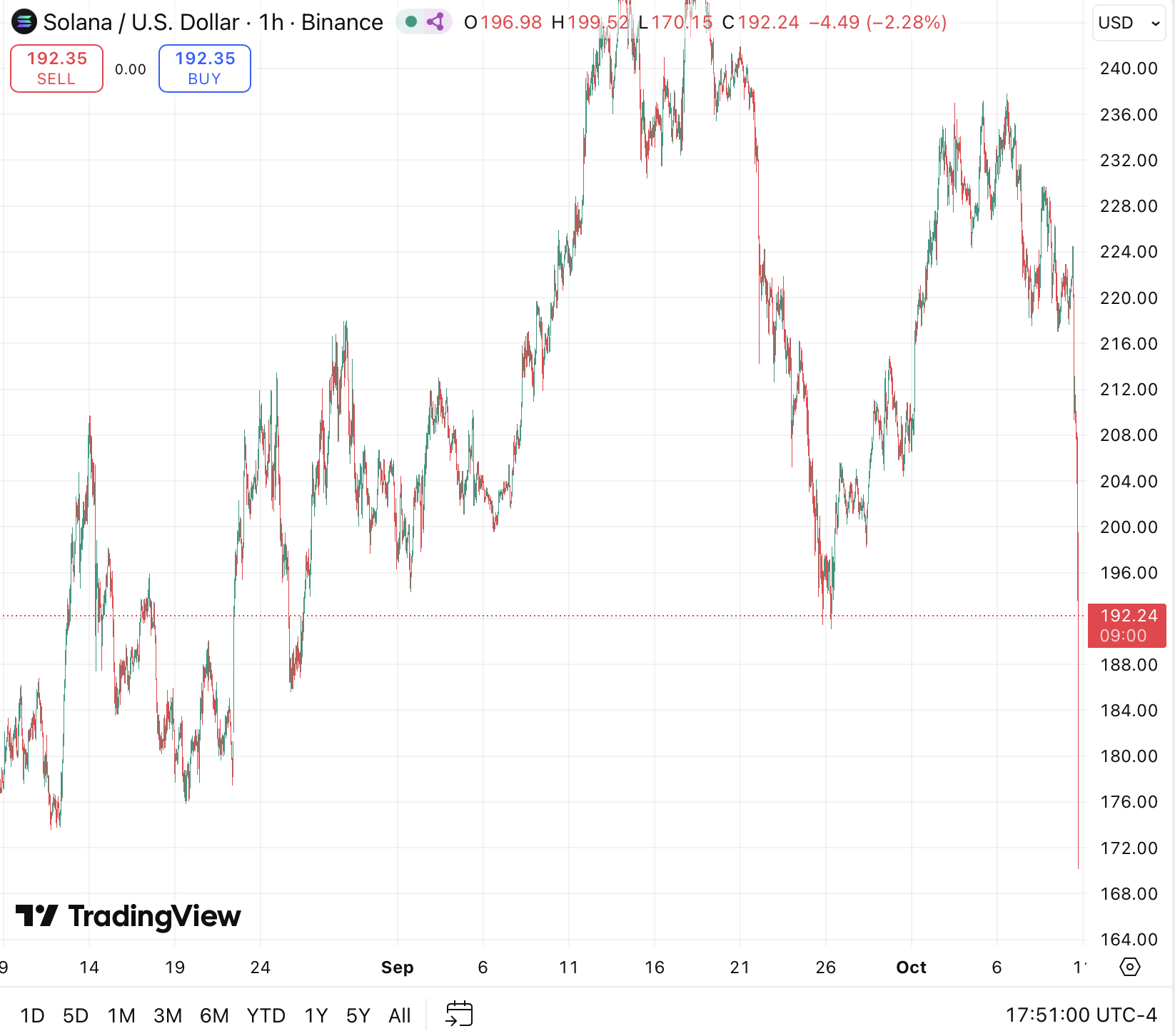 Solana (SOL) has dropped 11.8% in the last 24 hours, trading around $192 at the time of writing, as the broader cryptocurrency market experiences one of its sharpest sell-offs of the quarter.