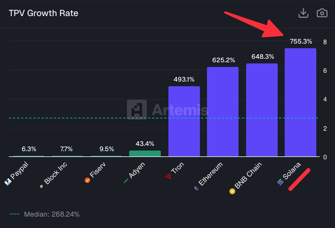 According to data compiled by Artemis, Solana recorded a 755.3% increase in Total Payment Volume (TPV), the highest growth rate across all platforms included in the comparison.