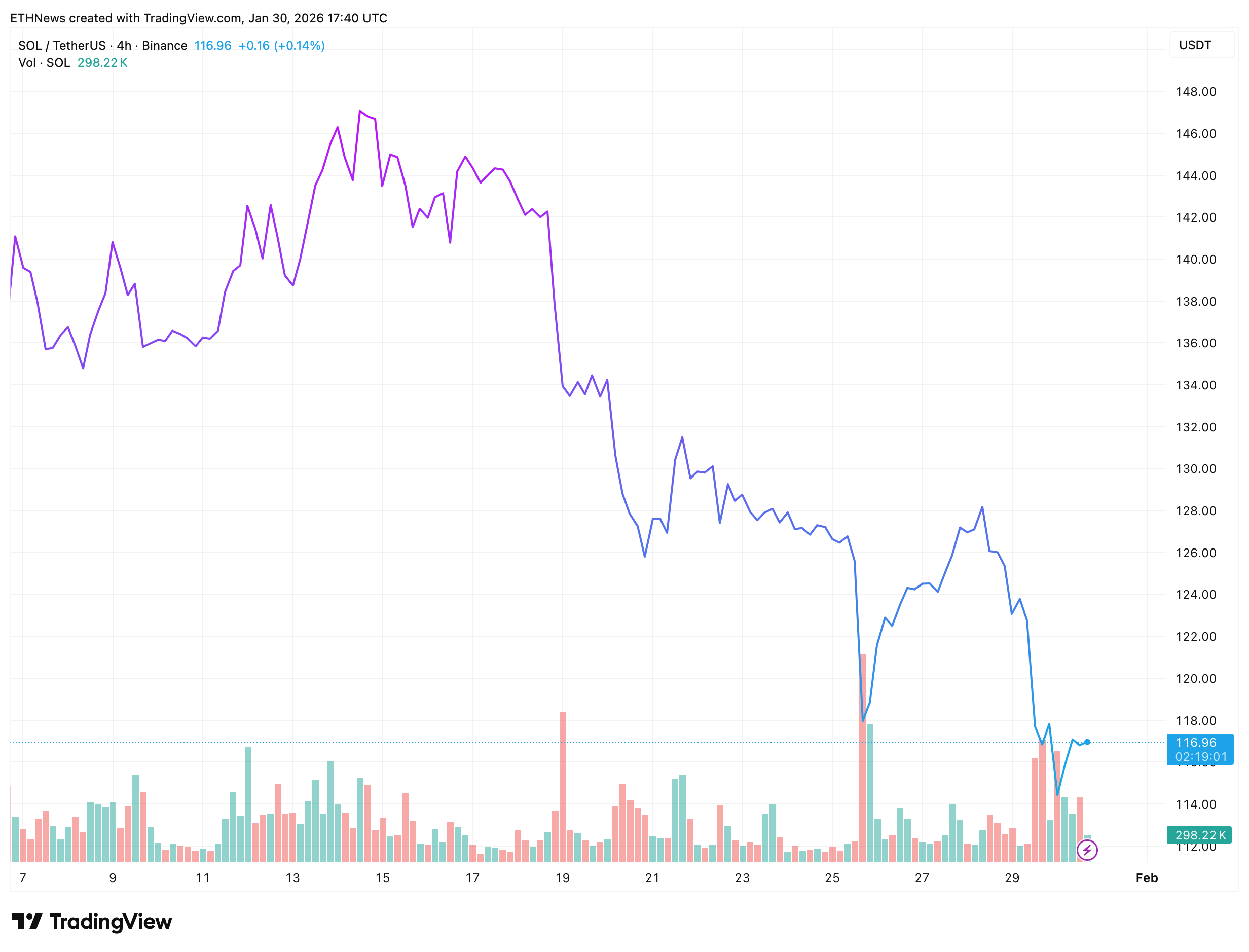For any constructive recovery to develop, Solana would need to reclaim $120 and show acceptance above that level, ideally with follow-through toward $125–$128. Without a decisive reclaim, upside moves remain vulnerable to rejection. - Bearish invalidation scenario: