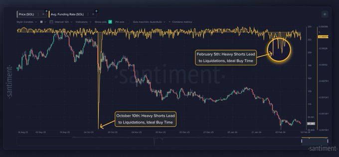 The chart shows that funding turned deeply negative during major drawdowns, particularly around October 10th and again in early February. The annotations highlight that heavy short positioning previously led to liquidation cascades and price rebounds.