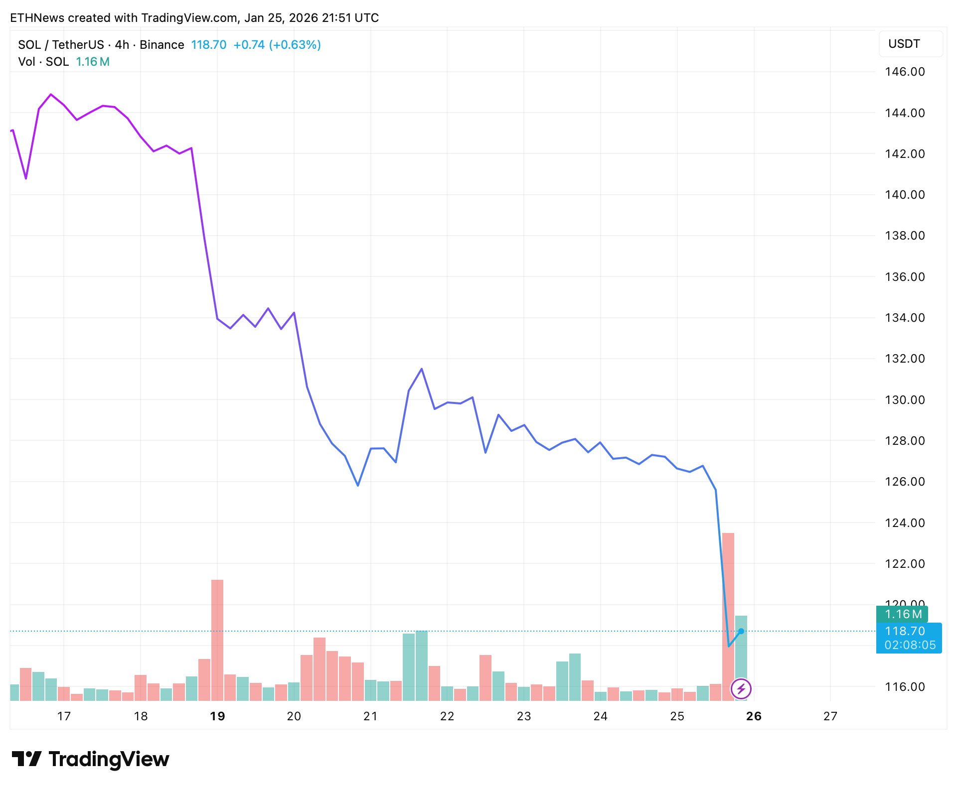 Solana (SOL) is trading near $118, following a sharp multi-day decline that has erased a significant portion of its recent gains.