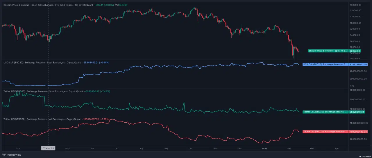 According to data shared by CryptoQuant, the positioning of stablecoin reserves across Ethereum and Tron rails suggests defensive capital posture rather than active accumulation.