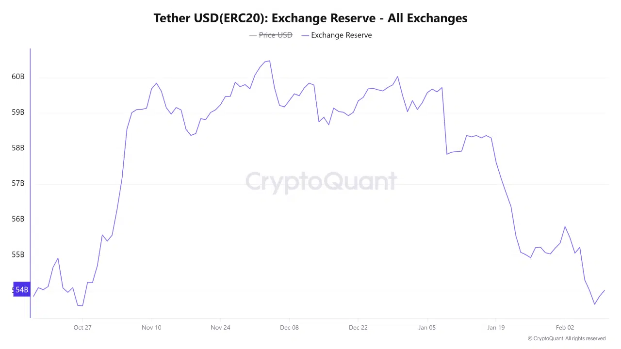 On-chain data shows a sharp decline in USDT exchange reserves, signaling that market buying power is weakening rather than positioning for dip-buying.