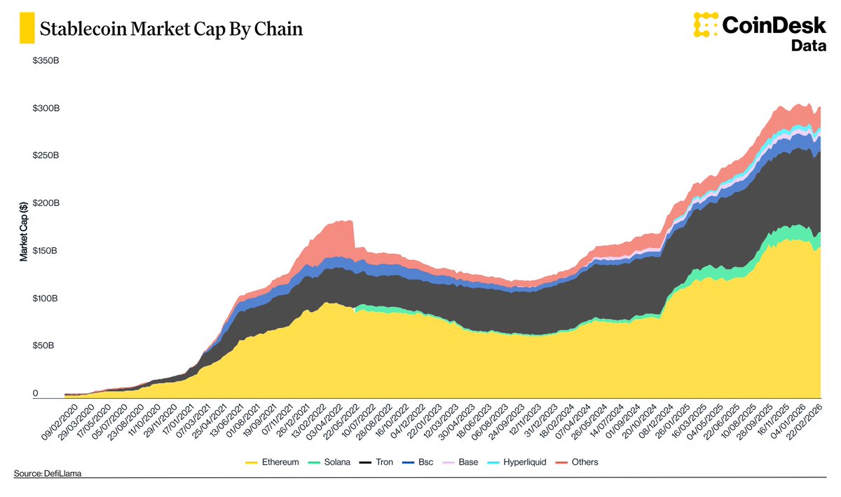 The total stablecoin market capitalization has officially moved above $300 billion, marking a nearly sixfold increase from under $50 billion in early 2020.