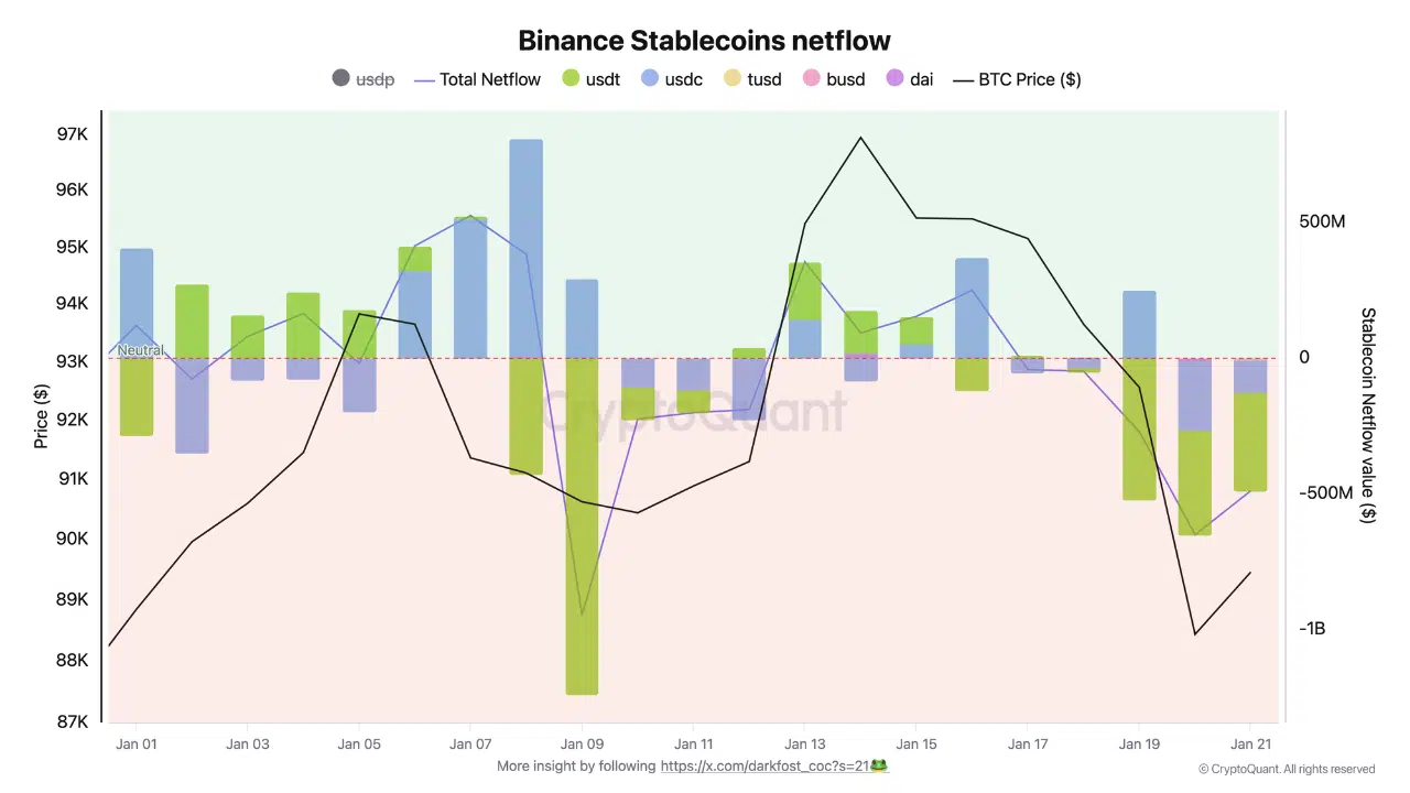 The most notable example came on January 9, when net outflows approached $950 million, far exceeding the largest single-day inflow of roughly $380 million. More recently, the trend has continued: over $1.4 billion in stablecoins, primarily USDT, have exited Binance in just three days.