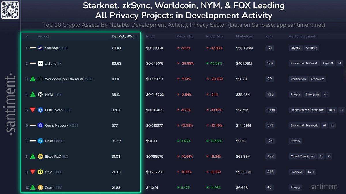 Despite sharp price declines across much of the market, Santiment’s findings reveal that developer activity in privacy-related and scaling ecosystems has remained remarkably steady. Projects like zkSync and Starknet have seen significant testnet upgrades and code pushes in recent weeks, while Worldcoin’s verification infrastructure continues to expand globally.