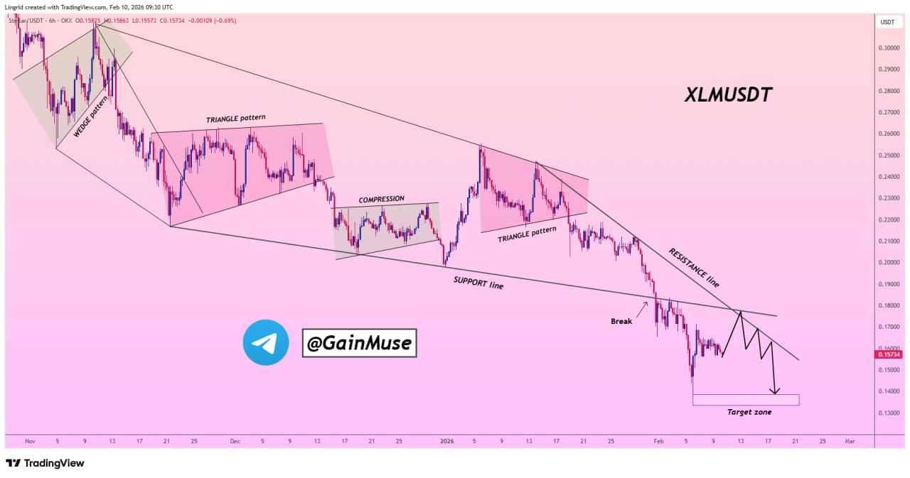 According to GainMuse, XLMUSDT has broken below a key ascending support that previously held through multiple compression phases and triangle formations. Each recovery attempt inside those structures failed beneath descending resistance, reinforcing the view that sellers remained in control throughout the decline.