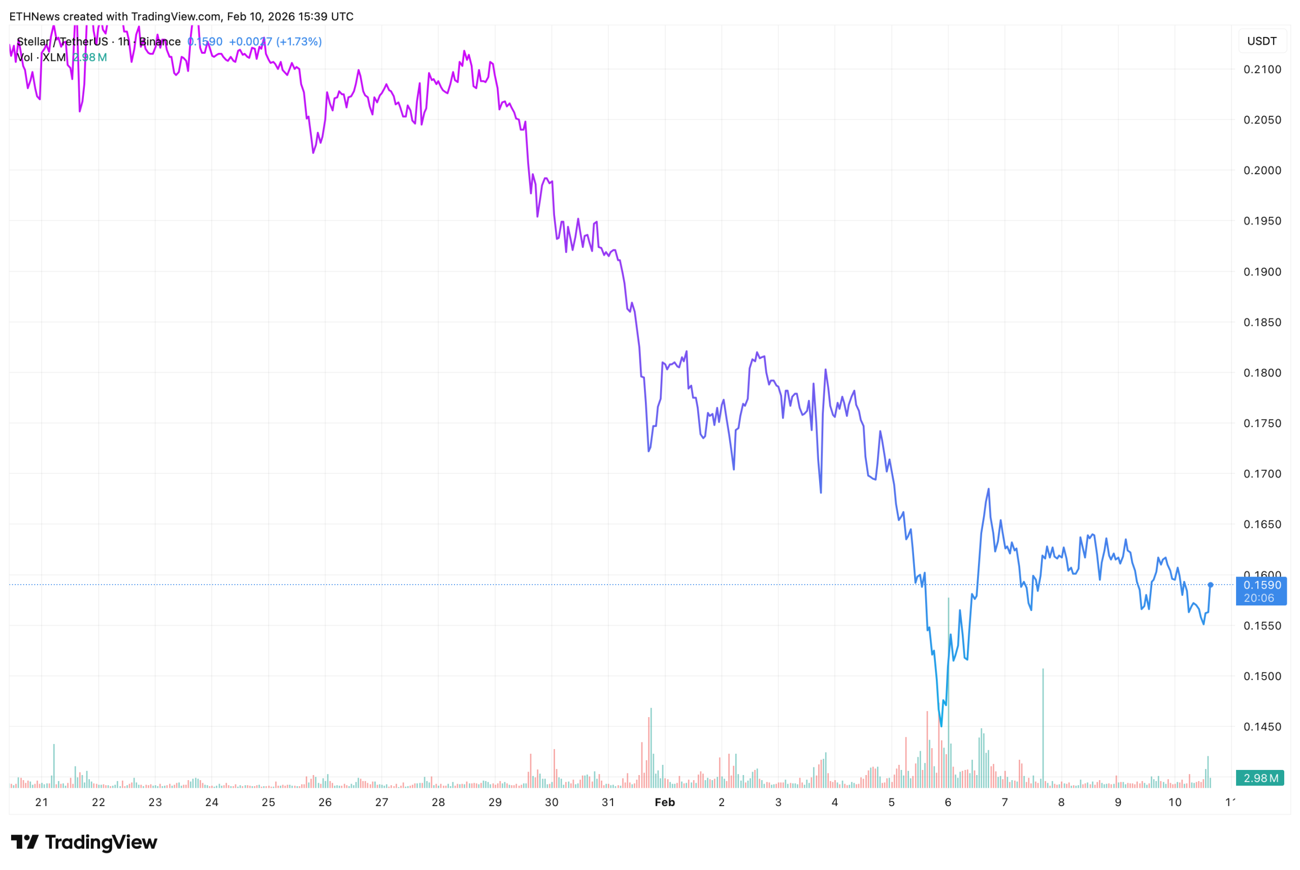 If sellers maintain control, the chart suggests downside continuation risk toward the highlighted target zone below $0.15. Conversely, any meaningful shift in structure would require XLM to reclaim $0.17+ and hold above former support on a closing basis.