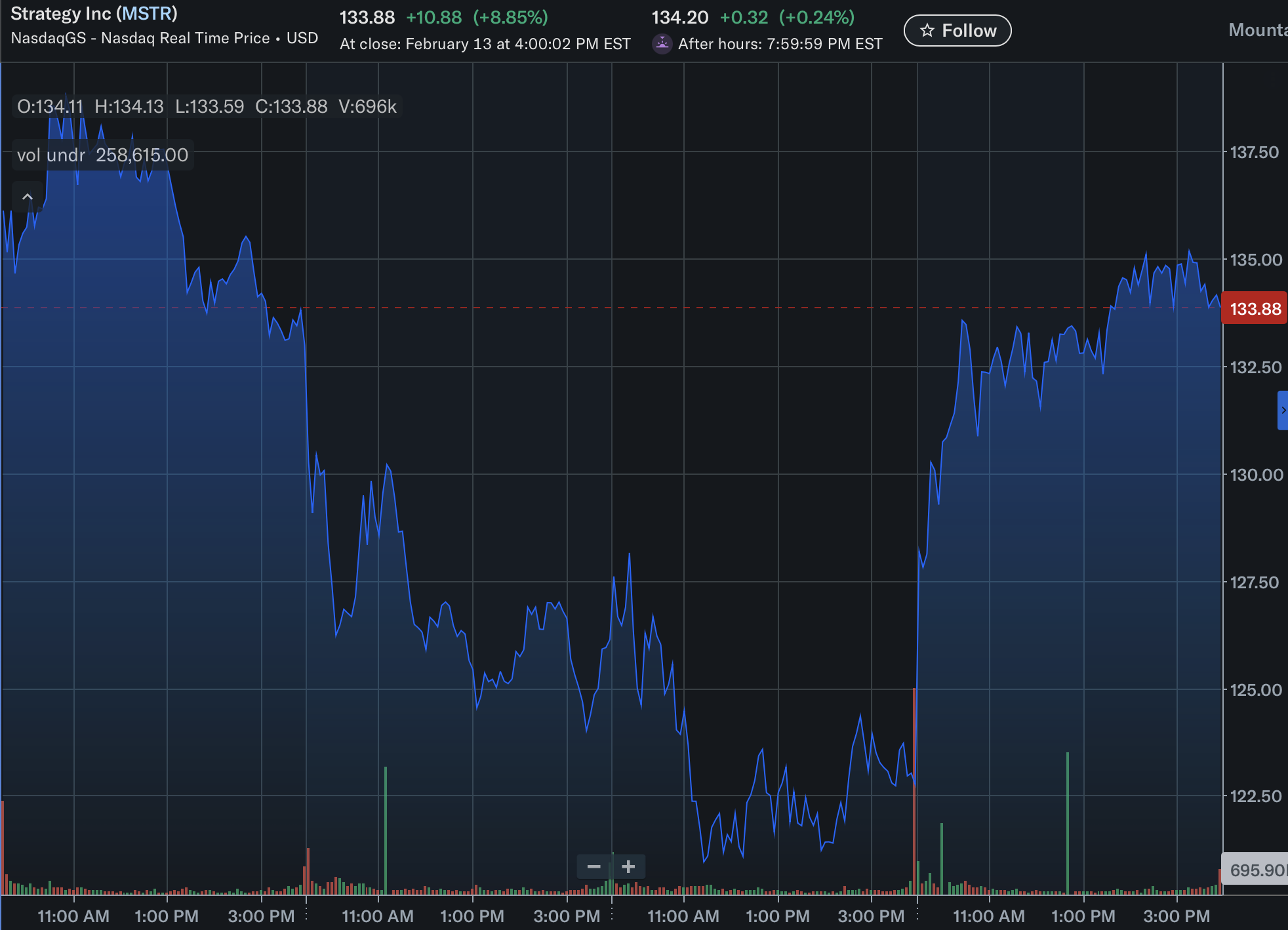 Shares of Strategy (NASDAQ: MSTR) climbed 8.85%, closing at $133.88, as broader crypto markets staged a recovery.